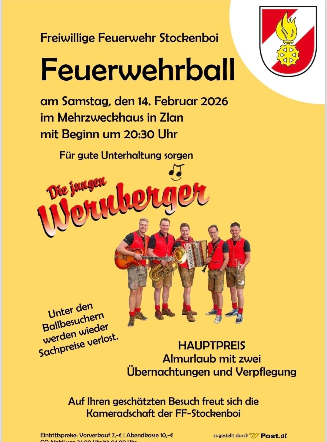 Die Freiwillige Feuerwehr Stockenboi lädt herzlich zum Feuerwehrball ein! Für beste Stimmung sorgt Die jungen Wernberger